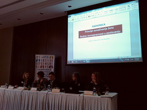 Radionica o Principima osnaživanja žena – Rodna ravnopravnost u Poslovanju koja je održana od 4-6.02.2013. godine u Beogradu predstavlja početnu fazu projekta tokom koje se vrši obuka trenera za principe osnaživanja žena u kompanijama i preduzećima. Obuku su realizovale stručnjakinje UN Women i UN Globalni dogovor iz Njujorka koje su angažovane na radu na Principima žena globalno.