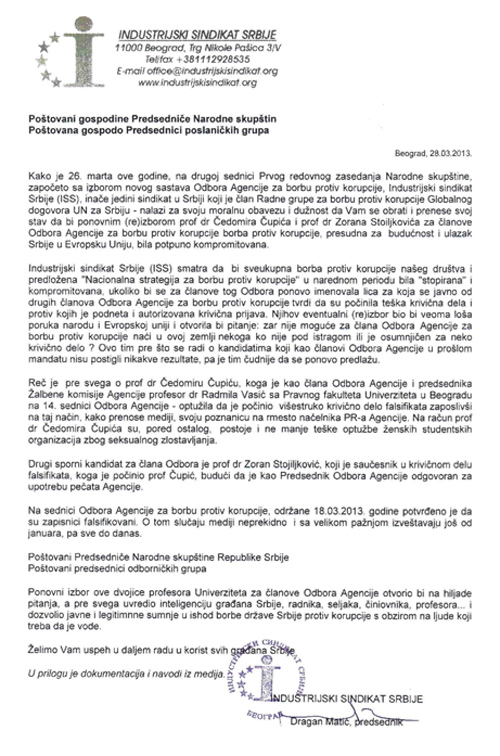 Kako je 26. marta ove godine, na drugoj sednici Prvog redovnog zasedanja Narodne skupštine, započeto sa izborom novog sastava Odbora Agencije za borbu protiv korupcije, Industrijski sindikat Srbije (ISS), inače jedini sindikat u Srbiji koji je član Radne grupe za borbu protiv korupcije Globalnog dogovora UN za Srbiju - nalazi za svoju moralnu obavezu i dužnost da Vam se obrati i prenese svoj stav da bi ponovnim (re)izborom prof dr Čedomira Čupića i prof dr Zorana Stoiljkovića za članove Odbora Agencije za borbu protiv korupcije borba protiv korupcije, presudna za budućnost i ulazak Srbije u Evropsku Uniju, bila potpuno kompromitovana.