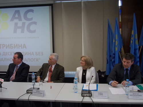 Posle pitanja Kosova tema koja već deset godina izaziva pažnju i kritiku javnosti se vezuje za Socijalni dijalog i (ne)rad Socijalno ekonomskog saveta. Ta činjenica motivisala je sindikat ASNS da organizuje tribinu u prostotijama Privredne komore Beograda sa temom „Srbija deset godina bez socijalnog dijalog“.