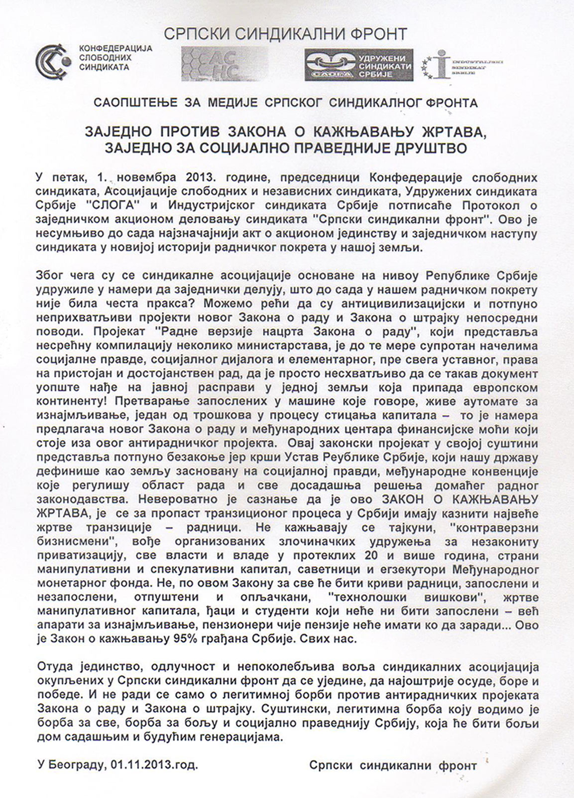 Srpski sindikati okupljeni u SRPSKI SINDIKALNI FRONT potpisali Protokol o zajedničkom delovanju sindikata. Pored države i poslodavaca protivnici i u Savezu samostalih sindikata Srbije i UGS „Nezavisnost“.