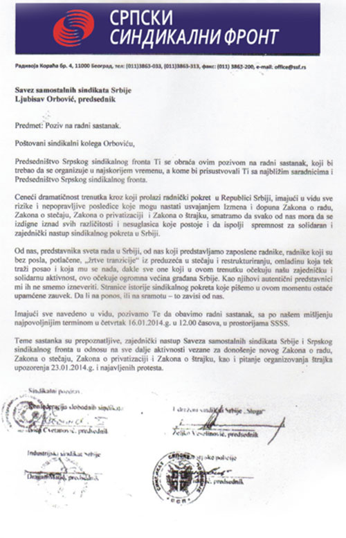 Analizirajući trenutnu situaciju u kojoj se radništvo Srbije i srpski sindikati nalaze Predsedništvo Srpskog sindikalnog fronta je donelo odluku da uputi pismo predsedniku SSSS Ljubisavu Orboviću i pozove ga da održi radni sastanak sa Predsedništvom Srpskog sindikalnog fronta sa krajnjim ciljem objedinjavanja svih započetih pojedinačnih sindikalnih aktivnosti vezanih za odbranu radništva Srbije od niza zakona koji su protiv interesa radnika i građana Srbije. Najavljeni sastanak bi trebao da se održi 16.01.2014.g. u 12.00 časova u prostorijama Saveza samostalnih sindikata Srbije.