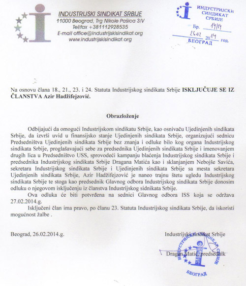 Pokušaj sindikalnog puča od strane Azira Hadžifejzovića i nekolicine istomišljenika da prisvoje Ujedinjene sindikate Srbije svojim malenkostima kao i organizovanje sednice Predsedništva USS bez ikakvog uključenja organa i rukovodstva Industrijskog sindikata Srbije, kao i odbijanje da se Industrijskom sindikatu Srbije, tačnije predsedniku Glavnog odbora Draganu Matiću podnese izveštaj o finansijskoj situaciji i poslovanju u Ujedinjenim sindikatima Srbije opredelilo je donošenje odluke o isključenju Azira Hadžifejzovića iz članstva Industrijskog sindikata Srbije.