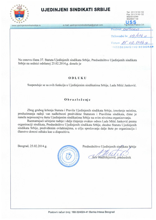 Ovo nije kraj aktivnostima Azira Hadžifejzovića koji je iz samo njemu znanih razloga suspendovao Ladu Mitić Janković sa mesta predsednice sindikata Kliničkog centra Srbije.
