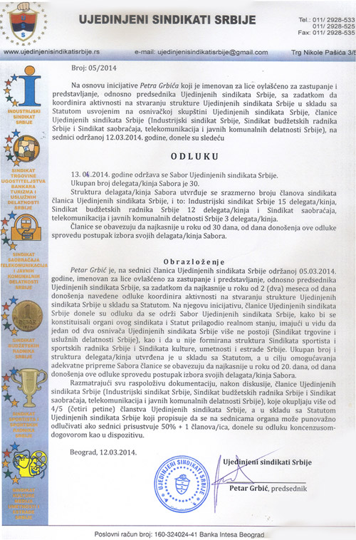 Do ove Odluke je došlo na osnovu inicijative Petra Grbića, predsednika Ujedinjenih sindikata Srbije koji je odgovorno i efikasno sproveo svoje zaduženje dobijeno od od članica USS.
