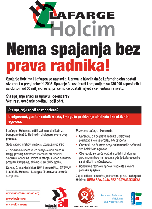 Članice Svetskih globalnih sindikata IndustriAll BWI i EFBWW pokrenule su kampanju „Nema spajanja bez prava radnika“ u cilju zaštite zaposlenih širom sveta koji rade za Holcim i Lafarge.