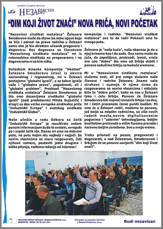 Nezavisni sindikat Železare Smederevo se putem „Informatora“ obratio radnicima Železare. Novi početak u novim digitalizovanim zelenim pogonima sa mladom radnom snagom. Dogovorom i radom do uspešnog poslovanja i napretka a pregovorima do boljih plata.