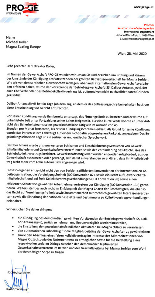Austrijski sindikat PRO-GE je uputio pismo upozorenja Magna Seating-Odžaci zahtevajući da se otkaz o radu koji je dat predsedniku IS Magna Seating Daliboru Antanasijeviću povuče a ranije ispregovaran Kolektivni ugovor potpiše.