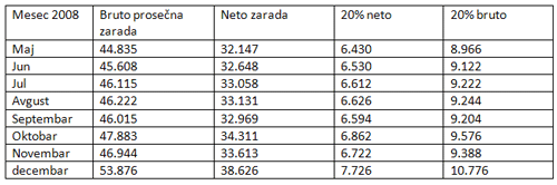 Tabela:Pregled prosečne zarade od 05.2008.-12.2008. sa 20% za ishranu u toku rada (dinari) i