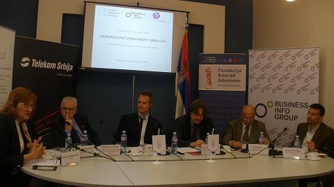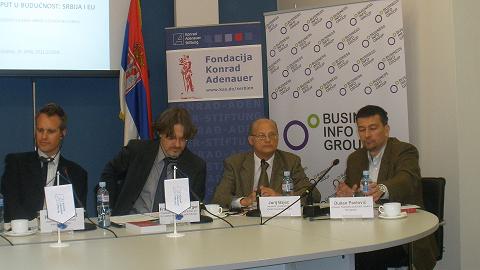 19.04.2011. U organizaciji Fondacije Konrad Adenauer(KAS) i Biznis Info Grupe, u Beogradu je održan X ekonomsko –politički forum na temu: Prednosti i izazovi ulaska Srbije u Evropsku uniju. Forum je u okupio značajne eksperte iz oblasti evropskih integracija i ekonomije sa ciljem da komentarišu Ekonomski put Srbije ka EU i trenutnu ekonomsko političku situaciju. Zajednički stav je bio da je EU sredstvo a ne cilj društvene reforme u Srbiji a da proces pristupanja, njegovi rezultati i rokovi zavise isključivo od nas samih i rezultata ekonomskih, političkih i socijalnih reformi, o čemu su govorili Jurij Bajec, savetnik predsednika Vlade Republike Srbije, Mihailo Crnobrnja, profesor Fakulteta za ekonomiju, finansije i administraciju (FEFA), Petrašin Jakovljević, direktor kompanije Metalac –Gornji Milanovac i Dušan Pavlović, profesor Fakulteta političkih nauka.