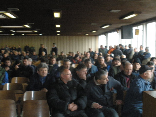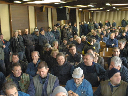 Preko 400 radnika Industrije mašina itraktora (IMT) na sastanku u organizaciji Industrijskog sindikata Srbije a na temu rada i opstanka IMT-a. Radnici zahtevaju opstanak IMT, posao i dostojan život.